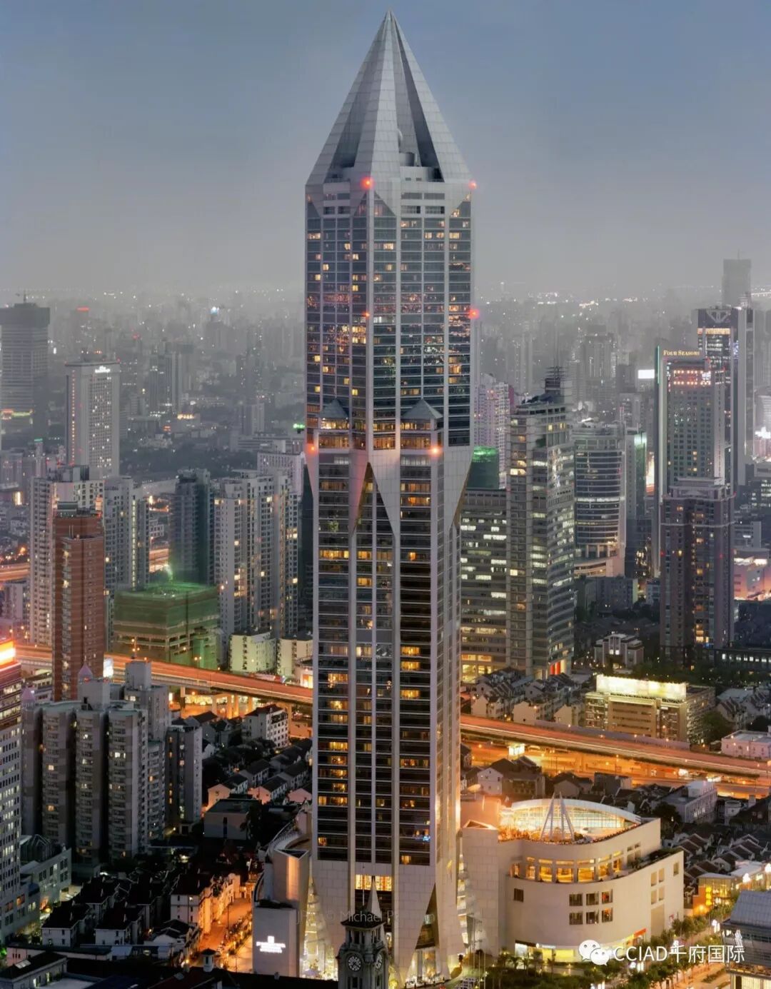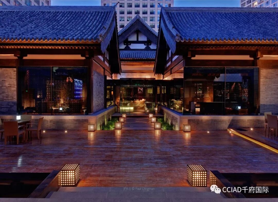 入夜后,大楼顶部会亮起红光,楼宇错落,仿若大红灯笼高挂,现代设计中不失中国韵味。约翰·波特曼改变城市天际线的美名,名副其实。