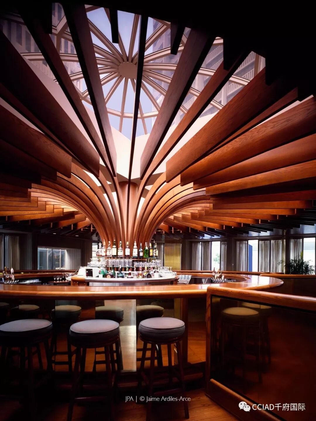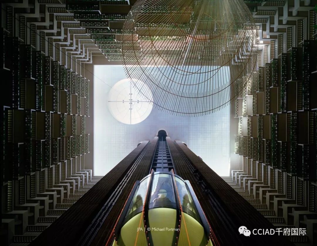 这是一个50层高的中庭,壮观、震撼都不足以来形容观感。建筑围绕中庭四散辐射,高耸的观光电梯宛如建筑脊柱。