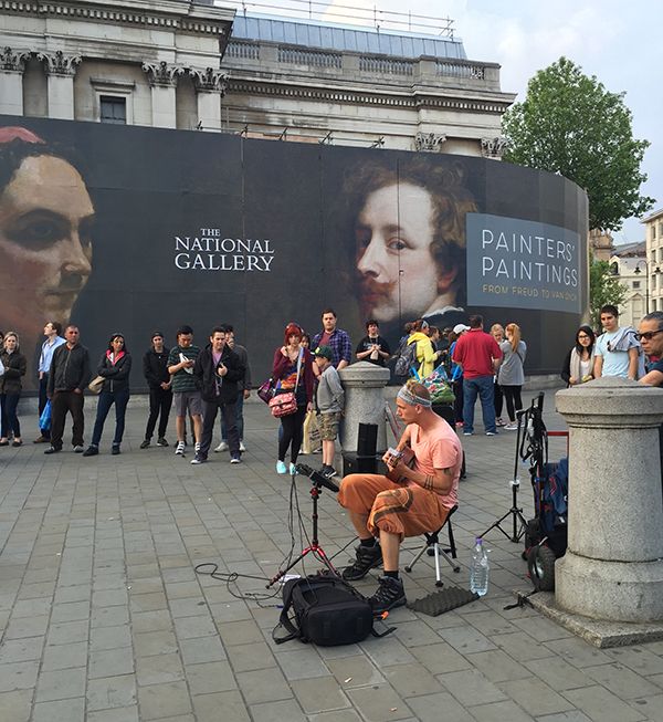广场坐落在伦敦市中心,东面是伦敦城,北面是国家美术馆,南邻白厅大街,西南不远是白金汉宫。当今广场上除了说着不同语言的游客之外,不乏行为艺术家、画家、演讲者、乐队,还有满天飞随地走的鸽子,充满了悠闲自得的生活气息。