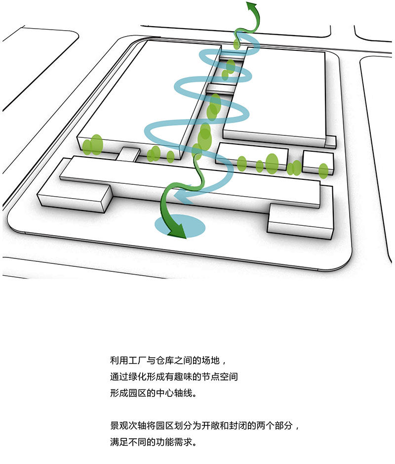 过南北和东西两条景观轴线贯穿整个基地,将三区进行空间分隔