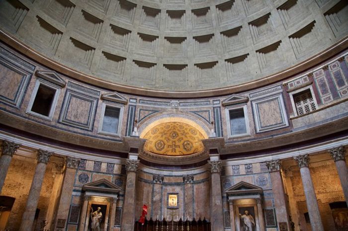 因为是公元前的家伙了,所以是至今唯一一座完整保存的古罗马帝国时期建筑。首先从建筑学上来说,这就是个奇迹。时至今日,万神殿仍然是世界上最大的无筋混凝土穹顶建筑。