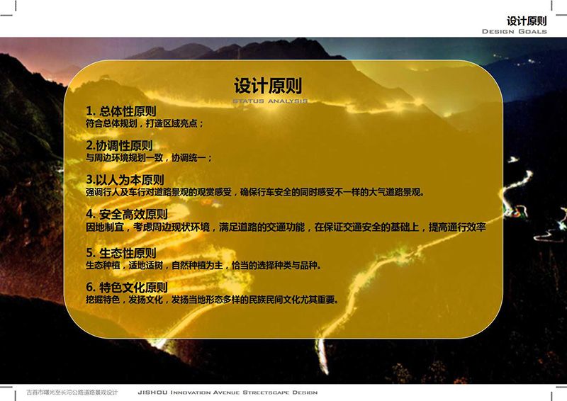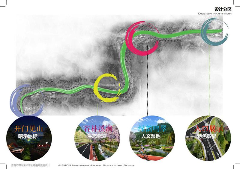 设计内容:包括河流水景、慢行系统、休闲驿站、停车场、有机农业、生态恢复、雨水收集、景观照明系统、给排水系统及沿路重要节点、护坡、沿路空间和山体空间等。