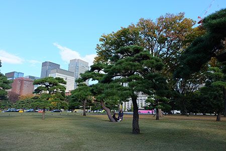 在皇居范围圈里,有很多大片的草地,种植着粗壮的植物。皇居外,大片的空地上铺着小砂石。一条河流蜿蜒淌过,有些像我们的护城河的意味。虽然不能够进入皇居里面,但是能够感觉到这个地方给人一种安静庄重的感觉。不过不同于我们故宫的大气磅礴,似乎规模不大。